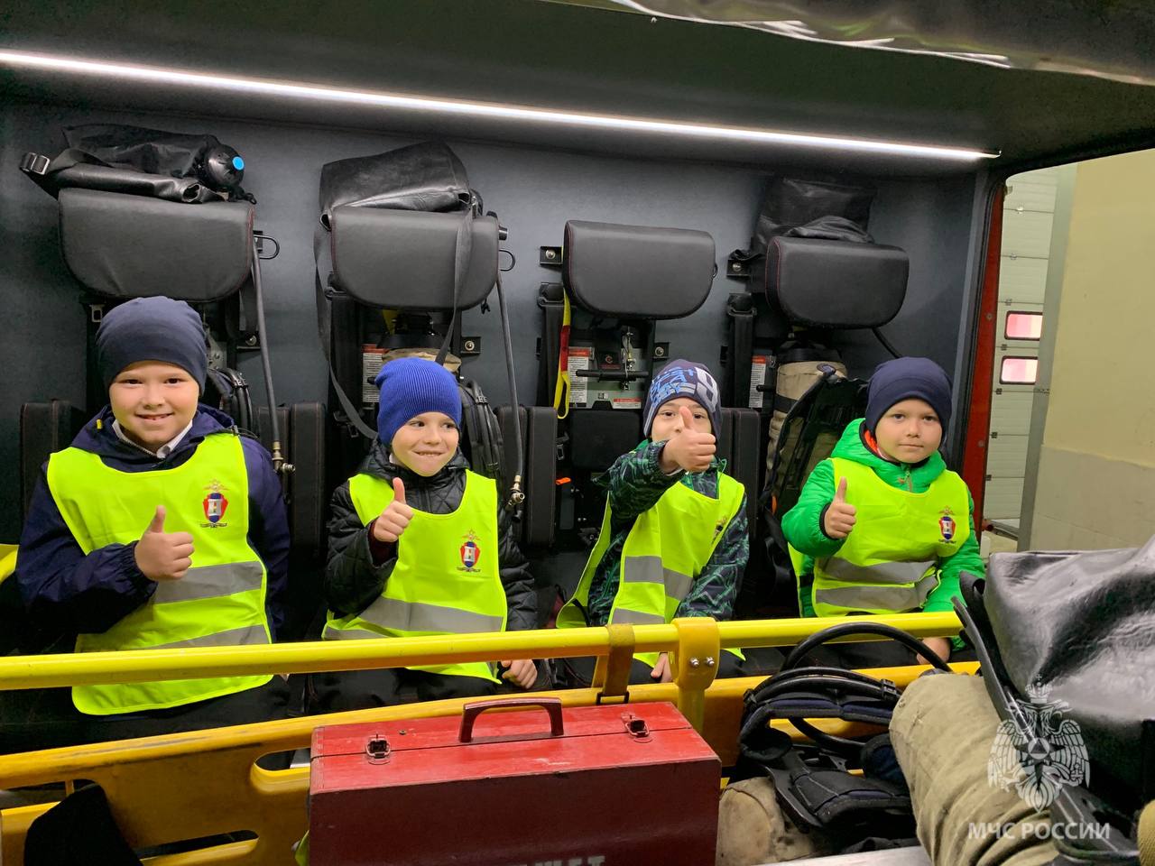 Школьники с большим интересом слушали рассказ об ответственной службе пожарных, с удовольствием примеряли боевую экипировку, включали сирену и проблесковые маячки, ощущая себя настоящими сотрудниками МЧС России. Особый восторг вызвала возможность посидеть в кабинах пожарных машин.