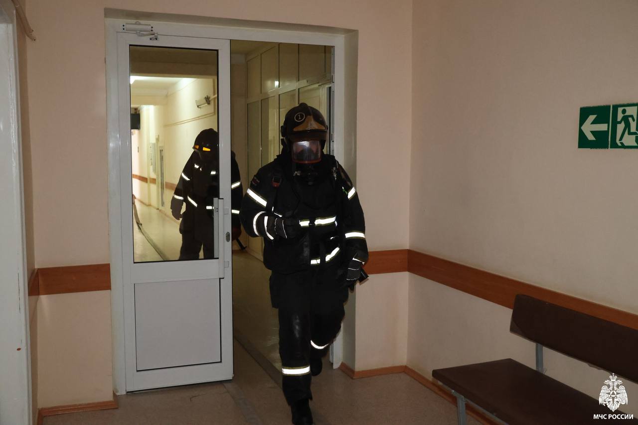 По легенде на 2м этаже терапевтического корпуса возникло возгорание. Персонал медучреждения организовал эвакуацию людей из здания.