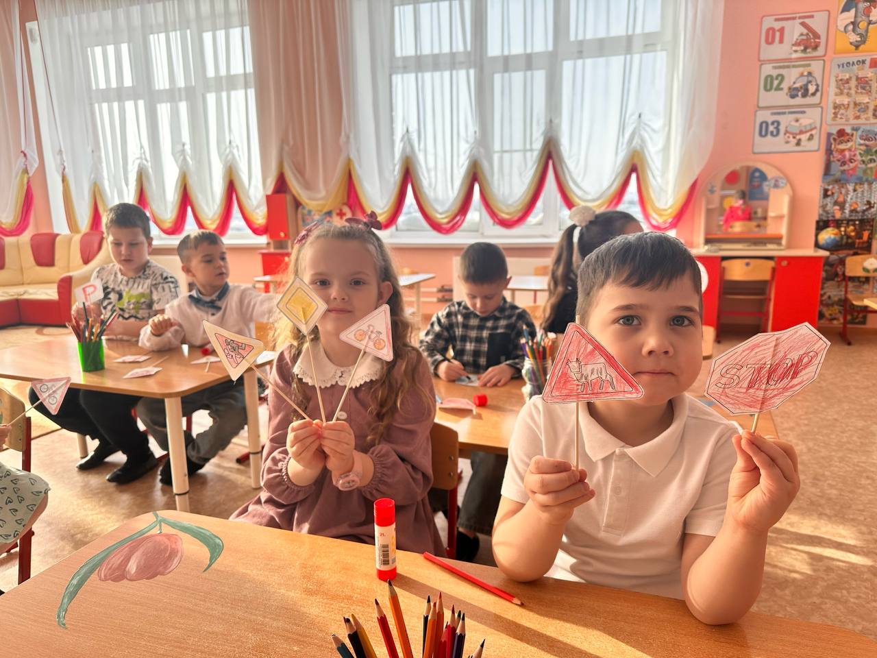 А самым интересным и запоминающимся моментом стало практическое занятие. Ребята своими руками, с помощью карандашей и клея, создавали дорожные знаки. Сделанные своими руками знаки станут для них не просто картинками, а символами, которые они будут узнавать и понимать на дороге.