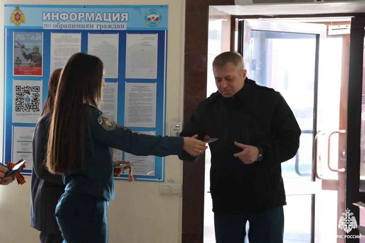 На входе в здание личный состав встречали представители Молодежного совета Главного управления. Каждому сотруднику ребята вручали главный символ воинской славы — Георгиевскую ленту.