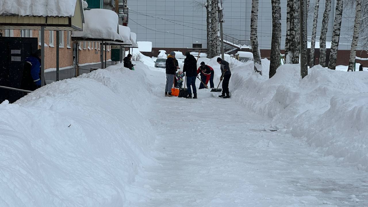 Во время обильных снегопадов на расчистку дворовой территории выходят жители дома 108 по пр. 70 лет Октября.Итог совместной работы - очищенный от снега двор!