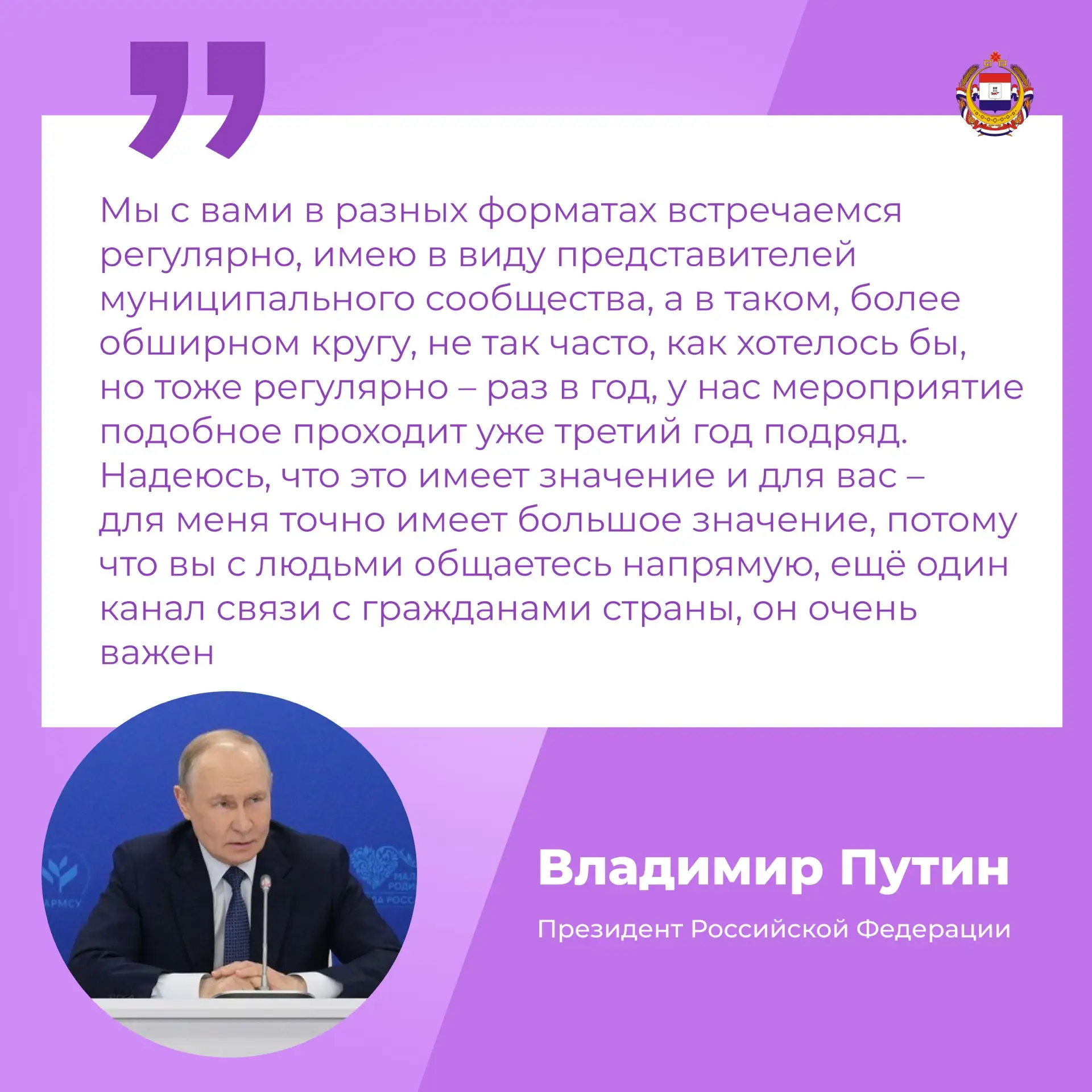 Встреча главы государства с представителями муниципального сообщества проводится ежегодно в рамках Всероссийского муниципального форума «МАЛАЯ РОДИНА – СИЛА РОССИИ», который проводит ВАРМСУ при поддержке Администрации Президента России.