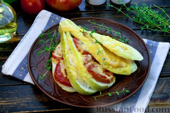 - Веер из кабачков с курицей и помидорами: оригинальное блюдо, в котором сочные слоёные кабачки запекаются с нежным куриным филе и свежими помидорами, покрытыми расплавленным сыром.