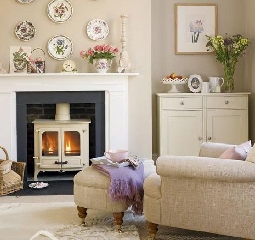 При выборе отделки предпочтение отдается натуральным материалам. Стены достаточно часто оформляются с помощью фактурной штукатурки или облицовочной доски с подкрашенным белым оттенком. Полы нередко покрываются досками или плиткой с эффектом «ушедшего времени». Линолеум и ковролин в этом стиле неуместны, что подчеркивает его деревенский характер.