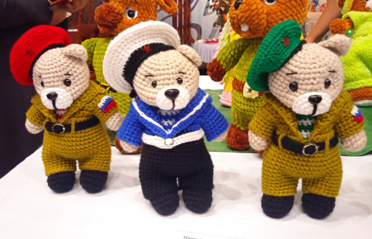 Вот какие бравые ребята, то есть мишки. Их сплела мастерица Наталья Митрофанова из села Большая Елховка.