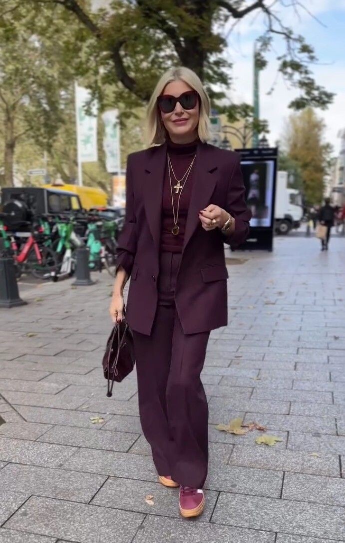 1. Стильный костюм в бордовых оттенках — это отличный выбор для современных женщин. Костюм состоит из свободных классических брюк с высокой посадкой, тонкой водолазки и удлинённого приталенного жакета. Здесь уместно сочетание с практичными светло-бордовыми кедами на толстой подошве.