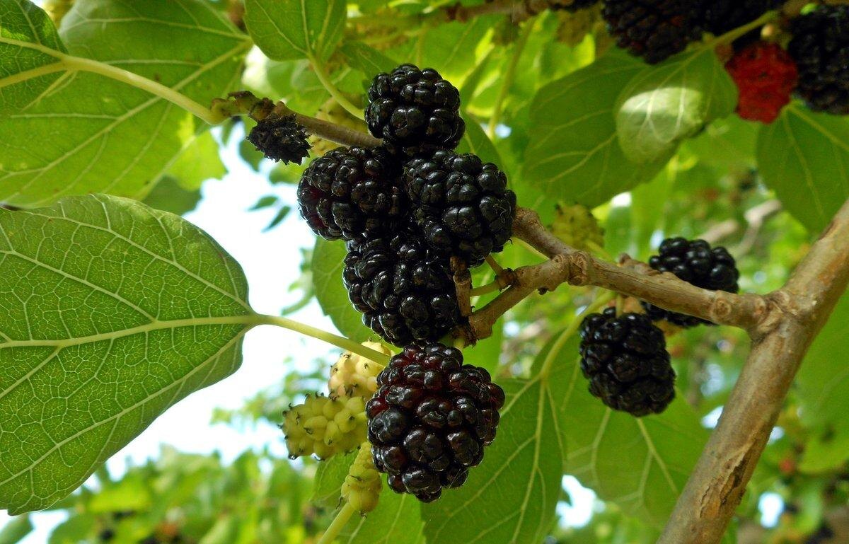 - Черная шелковица: компактна и имеет черно-фиолетовые плоды с приятным сладким вкусом, но менее устойчива к морозам.