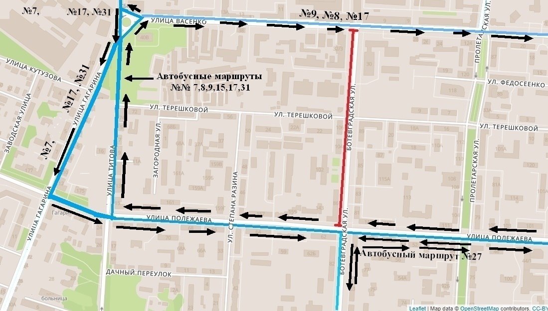 Автобусы по маршрутам № 7,17, 31 - также будут следовать по ул. Титова, в обратном направлении по ул. Гагарина и далее по действующим маршрутам.