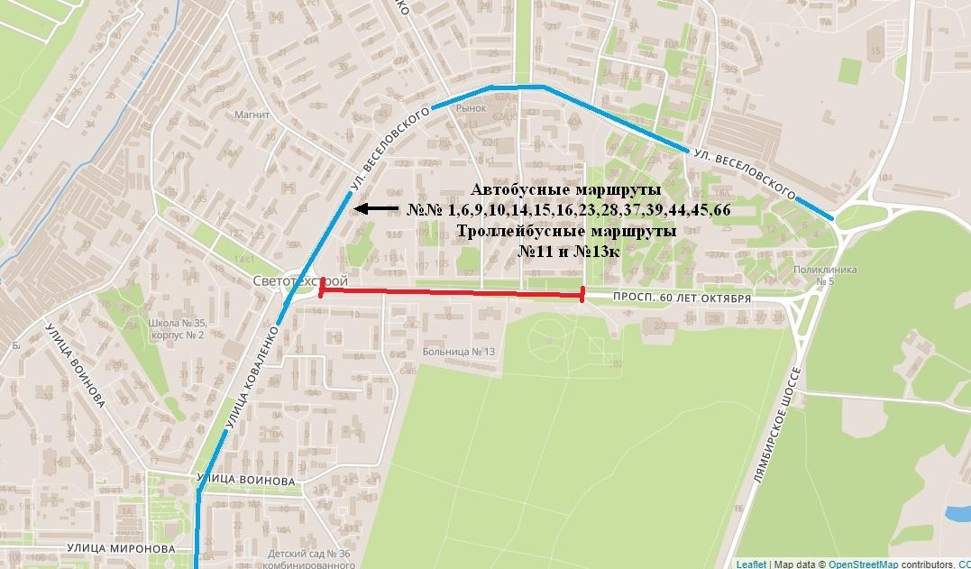 Троллейбусы по маршрутам №7, №8, №13к, 15, а также автобусы по маршрутам №№5, 14, 15, 28, 32, 40, 42: будут следовать по пр. 50 лет Октября до ул. Энгельса и в обратном направлении по действующей схеме маршрутов.