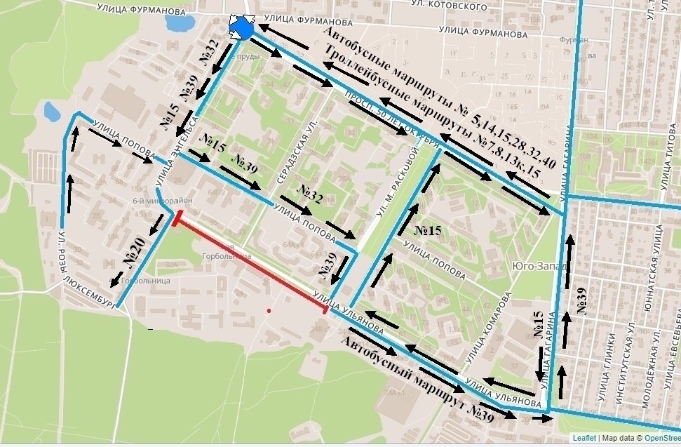 Автобусный маршрут №39 будет следовать по следующим улицам: ул. Энгельса, ул. Попова, ул. М. Расковой, ул. Ульянова и далее по действующей схеме маршрута.