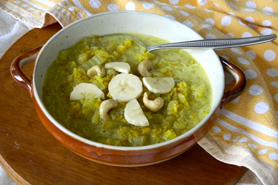 Первым делом стоит нарезать пекинскую капусту на тонкие полоски, а банан - кубиками. В кастрюле с толстым дном разогревается немного масла, после чего в него добавляется нарезанная капуста. Буквально через пару минут обжаривания нужно залить овощи заранее подготовленным овощным бульоном, а затем добавить красную чечевицу. Этот процесс не займет больше 10-15 минут, ведь красная чечевица готовится молниеносно.