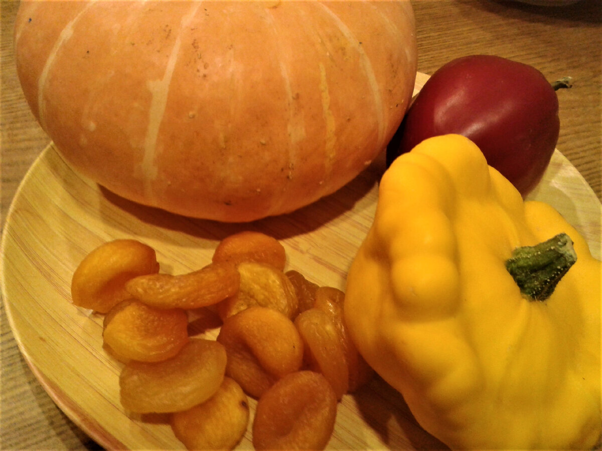 К основным ингредиентам относятся тыква, кабачок (в данном случае патиссон), курага и сладкий перец. Кроме того, понадобится лук, морковь, немного куркумы и других пряностей для создания насыщенного вкуса.