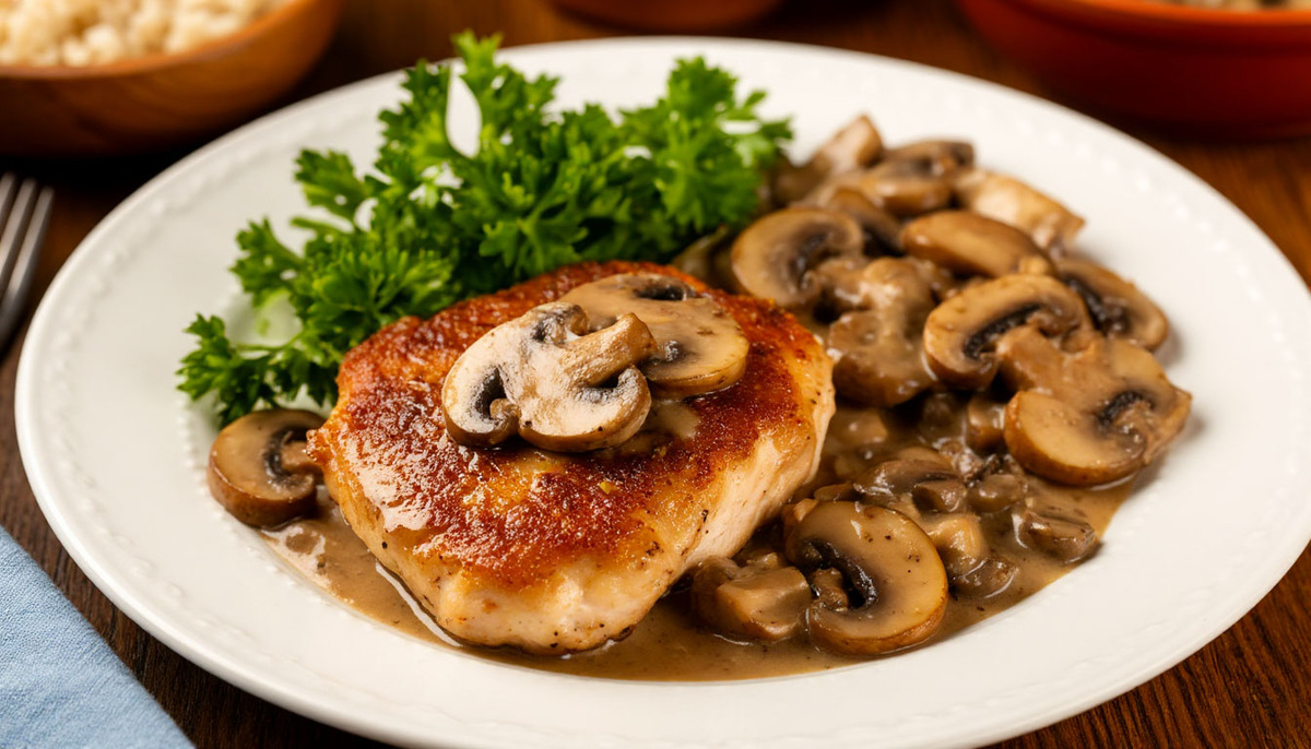 Выложить готовые куриные отбивные на тарелки и полить грибным соусом. Это прекрасное блюдо отлично сочетается с картофельным пюре, овощами или рисом. Для более насыщенного вкуса в соус можно добавить тертый сыр, а если он окажется слишком густым — разбавить небольшим количеством воды. Использование сметаны вместо сливок тоже допустимо, хотя соус будет менее нежным.