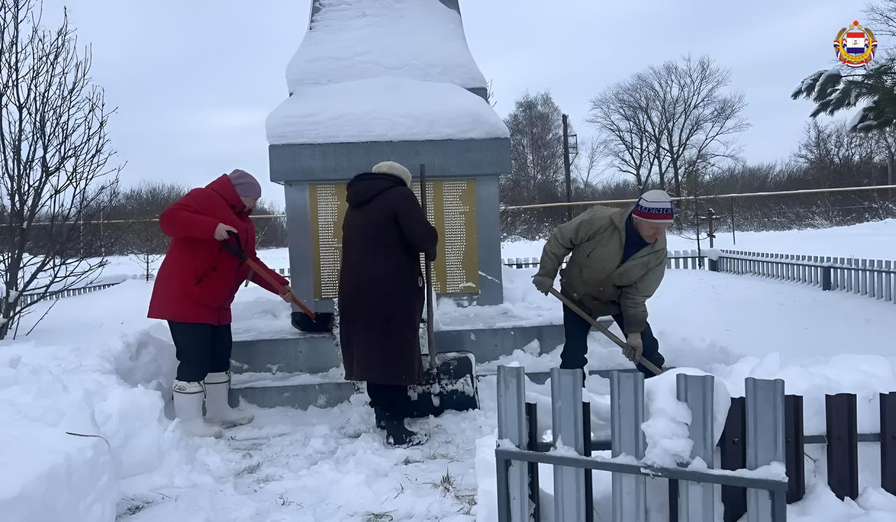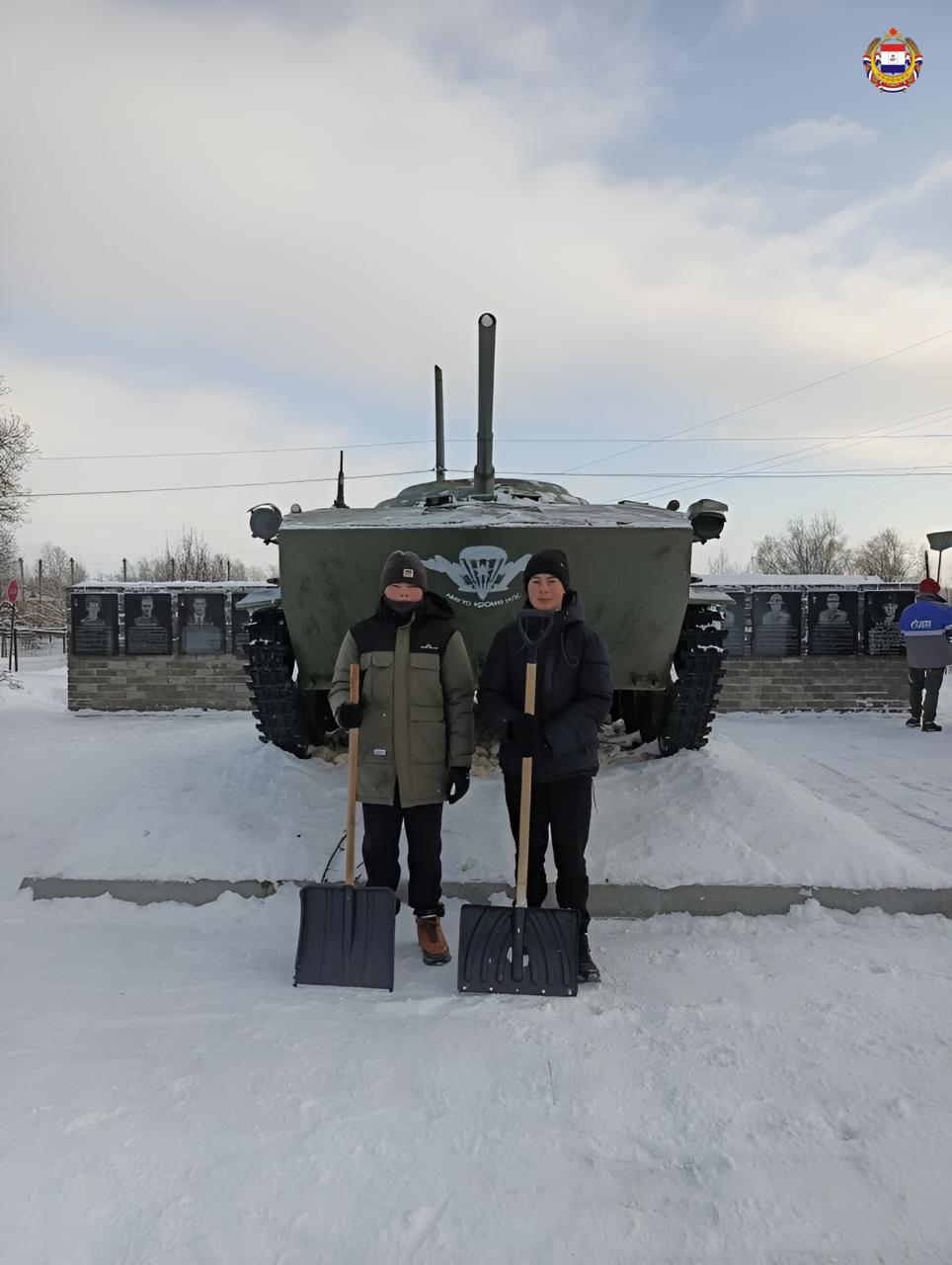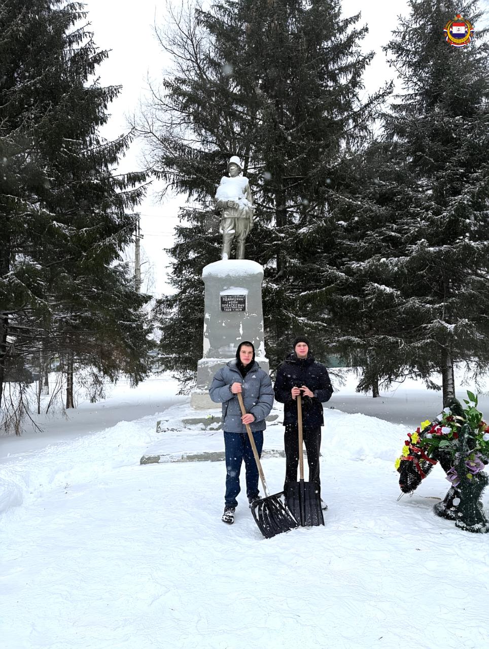 Школьники вышли на расчистку памятника погибшим воинам. Снег убрали быстро и слаженно – как знак уважения и памяти тем, кто отдал жизнь за мирное небо.