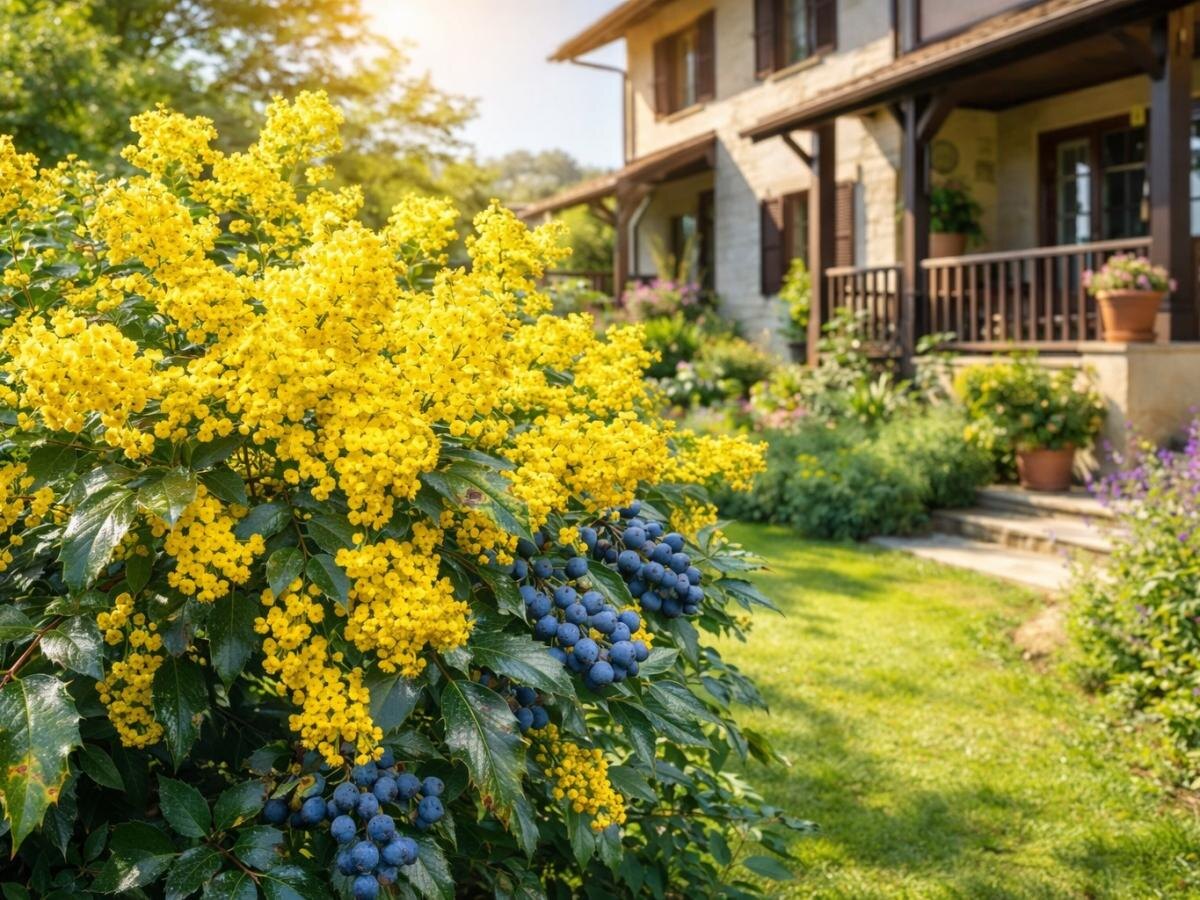 По краю участка неожиданно ярко расправляется куст, который кажется простым, но на деле хранит маленькую садовую магию: он цветёт обильно и щедро приносит плоды каждый год. В окружении нежной дымки ароматных кистей цвета солнца магония превращает обычный уголок в уютный садовый оазис.