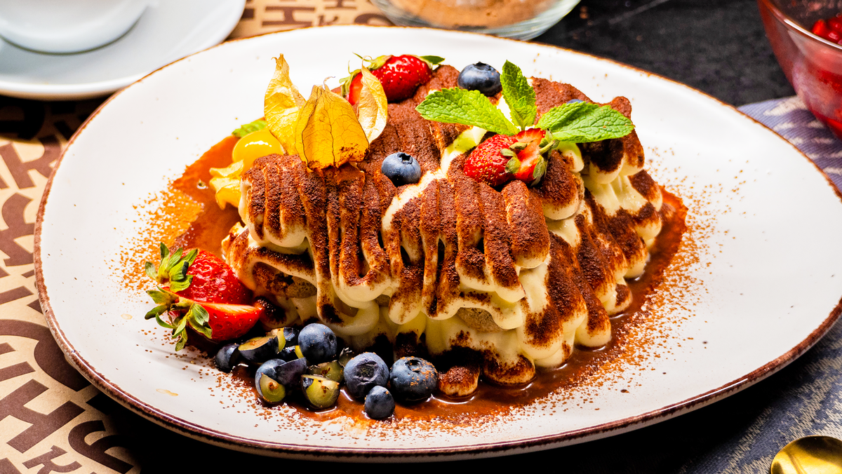 маскарпоне 250 г, савоярди 80 г, заваренный кофе 250 мл, какао-порошок 2 г, сахар 40 г, яйца С1 3 шт, ваниль 1 стручок, свежая клубника 25 г, свежая голубика 10 г, физалис 2 шт, мята 1 веточка.