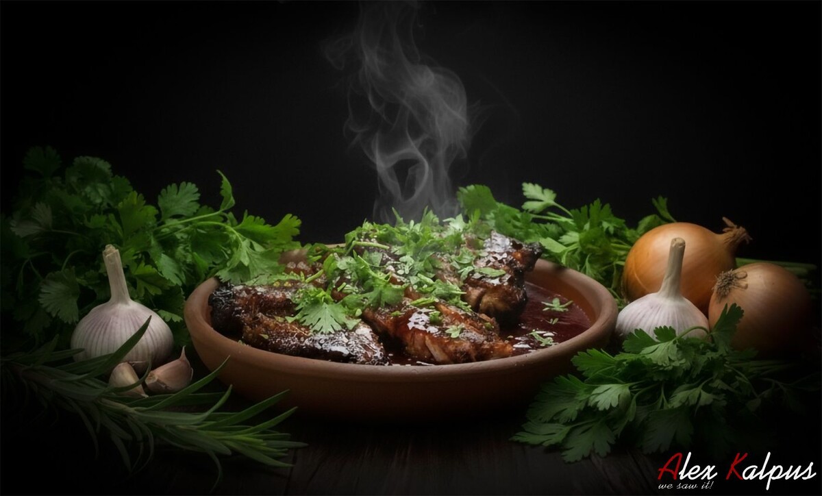 Говяжьи ребрышки в винном соусе — традиционное грузинское тушёное блюдо, которое ценят за неспешность приготовления и насыщенный вкус. Рецепт родом из винодельческих районов, прежде всего Кахетии, где молодое сухое красное вино служит не только напитком, но и кулинарной основой. Длительное томление делает мясо мягким, а вино превращается в густой, бархатный соус с яркой фруктовой кислинкой.