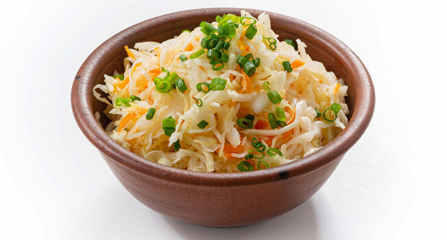 Подавайте квашеную капусту с ароматным подсолнечным маслом и свежим луком — это идеальное сочетание! Встретить её на столе можно в любое время года.