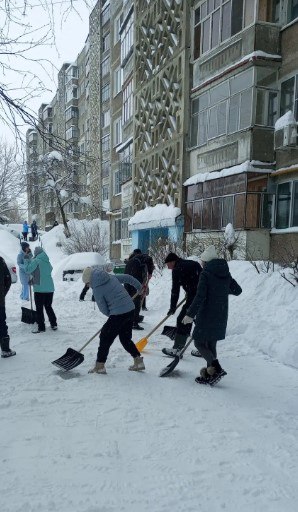 Во время обильных снегопадов на расчистку дворовой территории выходят жители дома 108 по пр. 70 лет Октября.Итог совместной работы - очищенный от снега двор!