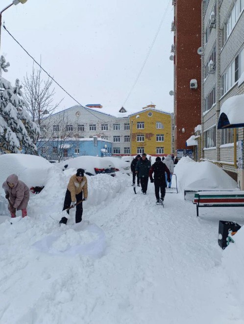 Во время обильных снегопадов на расчистку дворовой территории выходят жители дома 108 по пр. 70 лет Октября.Итог совместной работы - очищенный от снега двор!