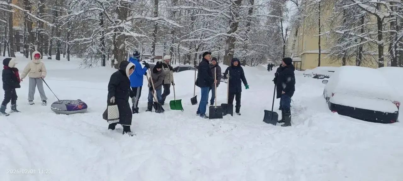 Убраны от снега тротуары в районе домов №№43, 56, 57, 42, 59, 195, 196, 153, 231, 52, 53. Также очищены пешеходные дорожки в районе детской игровой площадки. Всего было задействовано 19 человек.