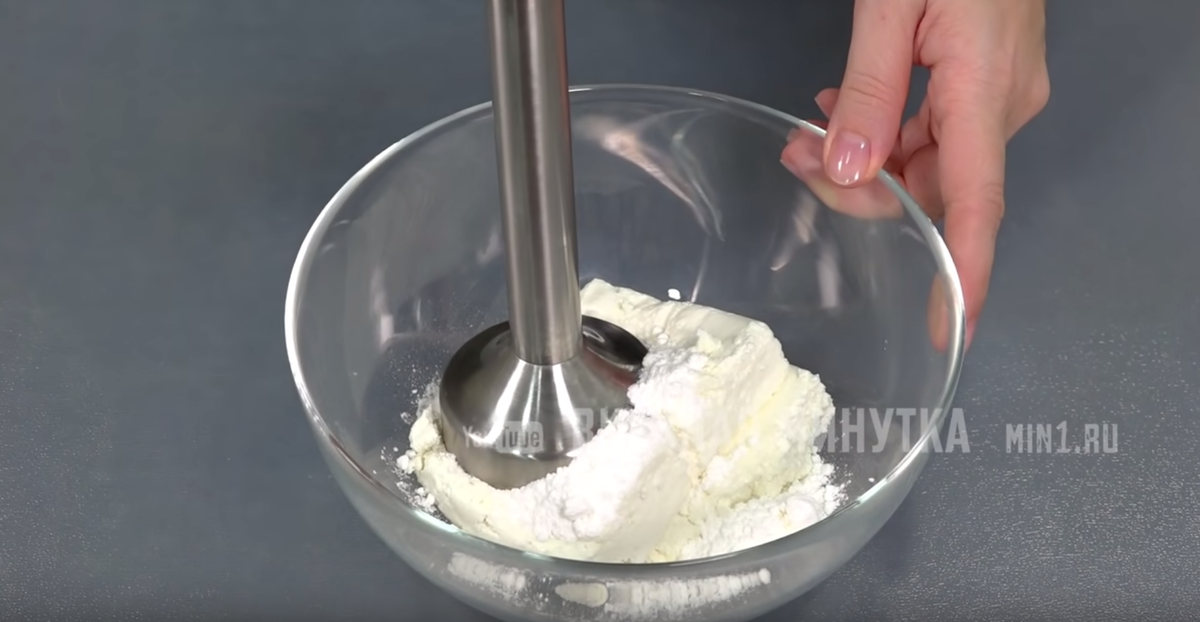 - Взбивание. Выложите творог в миску и добавьте половину сахарной пудры. Взбейте блендером до пастообразного состояния. Это не займет много времени!