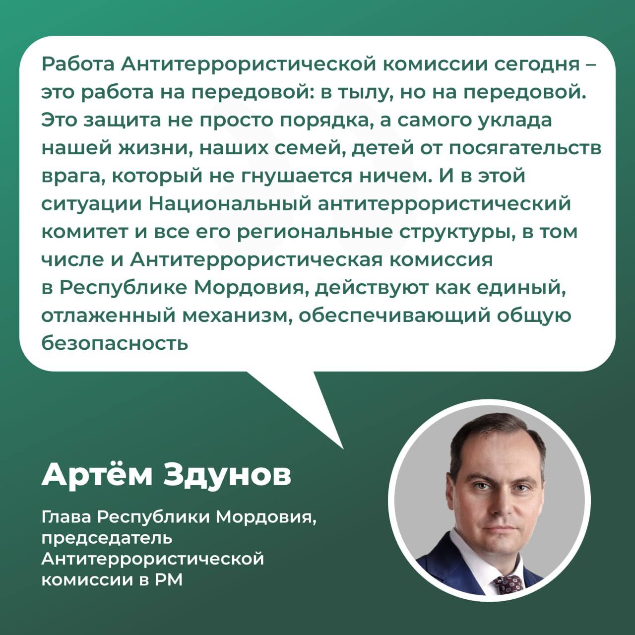 Региональным звеном этой системы является Антитеррористическая комиссия в Республике Мордовия, которая доказала свою действенность и результативность в вопросах противодействия терроризму и защиты спокойствия граждан.
