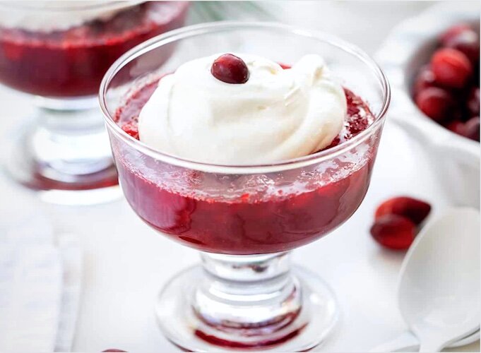 Этот десерт состоит из двух ярких слоев: красочного клюквенного желе и лёгкого крема шанти.
