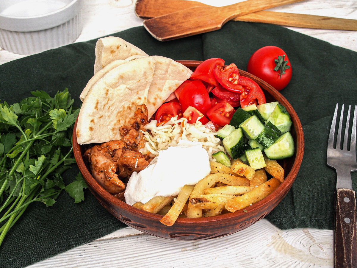 Пока курица готовится, нарежьте помидоры и огурцы крупными кубиками. Смешайте сметану с тхиной, корректируя вкус по своему усмотрению. Также подсушите пита на сухой сковороде, по 1 минуте с каждой стороны.