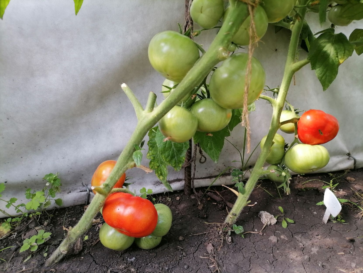Томаты растут в условиях поликарбонатного козырька, где температура значительно выше, чем в открытом грунте. Все помидоры собираются в начале сентября, после чего кусты сдаются в компост, чтобы минимизировать риски заболеваний на участке.