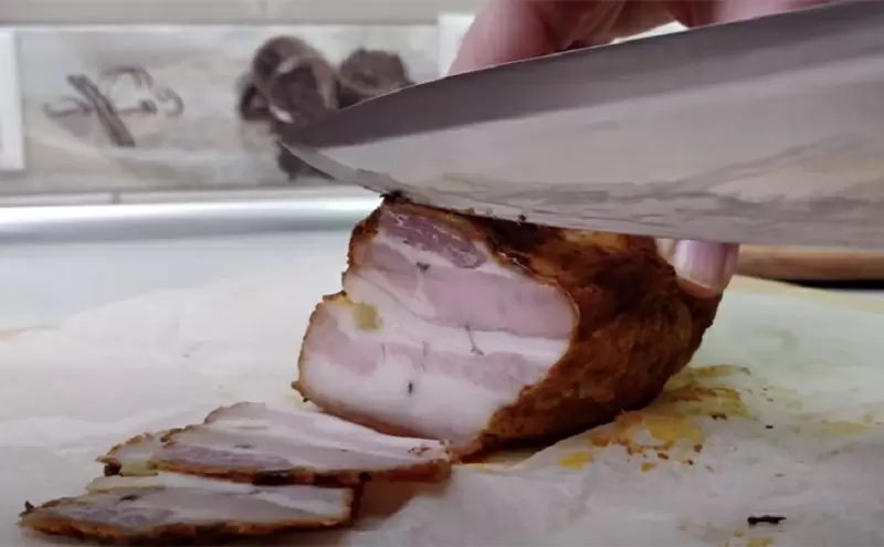 Приготовление мяса не требует особых усилий. Сначала грудинку нарезают на три части, делая небольшие надрезы и вкладывая в них кусочки чеснока для аромата. Вместо сложного маринада просто смешивают острый перец, специи и немного соли, тщательно натирая получившейся смесью каждый кусок мяса.