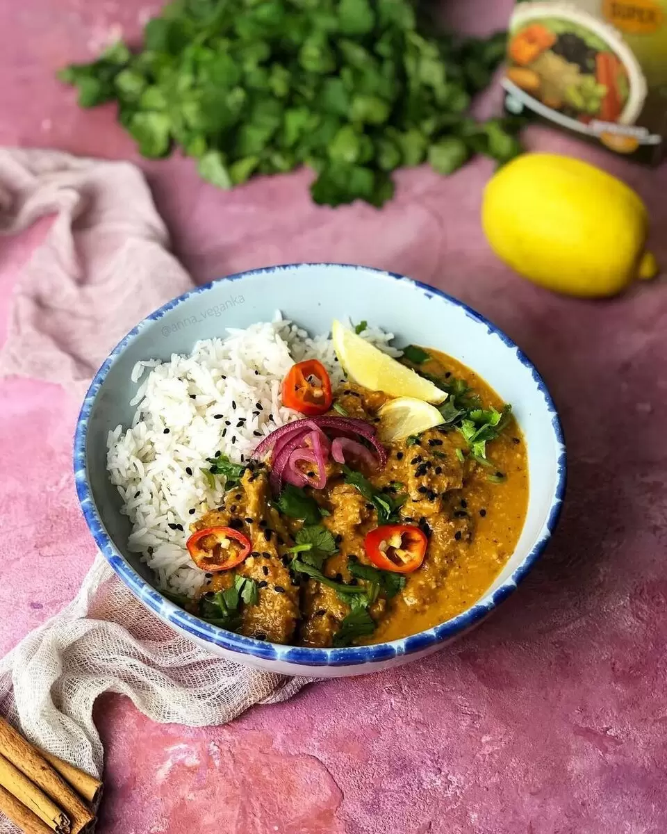 Подавайте блюдо горячим с рисом или лепешками, украсив свежей кинзой и дольками лимона. Этот насыщенный и ароматный карри станет настоящей находкой для любителей веганского питания.