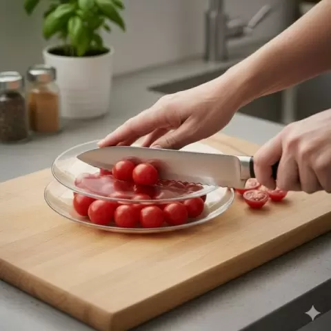 Лайфхак: Использование ножа с зазубринами (серрейтор) может быть полезно, если кожица помидоров слишком плотная — он аккуратно прорезает, не раздавливая их.