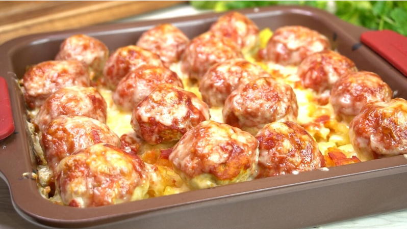 Готовое блюдо порадует не только глаз, но и вкус! Картофель напитался соками мясных шариков, а они остались сочными благодаря томатной глазури. Это идеальный вариант для ужина, способный завоевать сердца всех домочадцев!